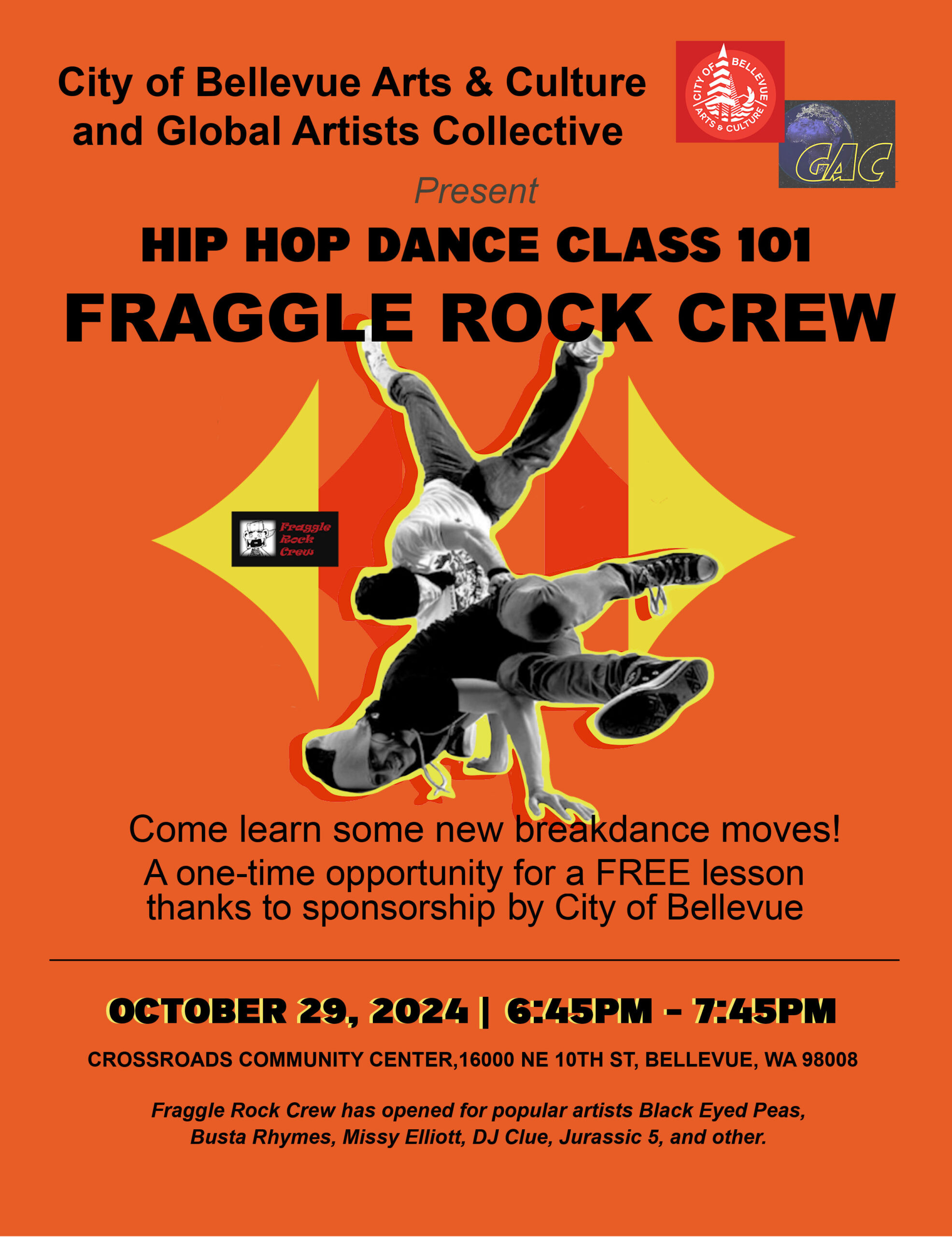 Crossroads Community Center 16000 NE 10th St, Bellevuew, WA, United StatesHip Hop 101 - Dance Class Tuesday, October 29, 2024, 6:45-7:45 PM Location: Crossroads Community Center (Community Room), 16000 NE 10th St, Bellevue WA 98008 Admission: Free for all-ages. Featuring members of FraggleRockCrew.com Fraggle Rock Crew will take you on a journey to the heart of Hip-Hop’s high-energy dance called Breakin’ (also known as B-boying, or Break Dancing). They combine dance and acrobatics with personal stories of their trials and […]